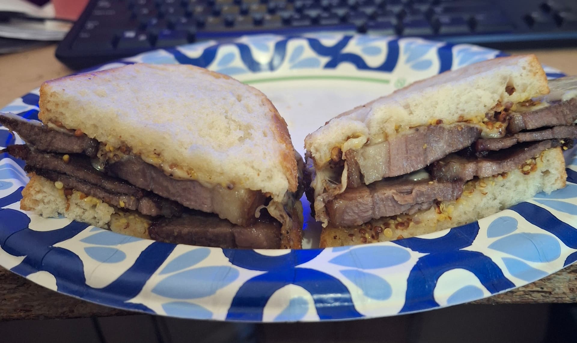 Brisket sandwich on lightly toasted sourdough with a slice of cheddar cheese and some all natural honey mustard.