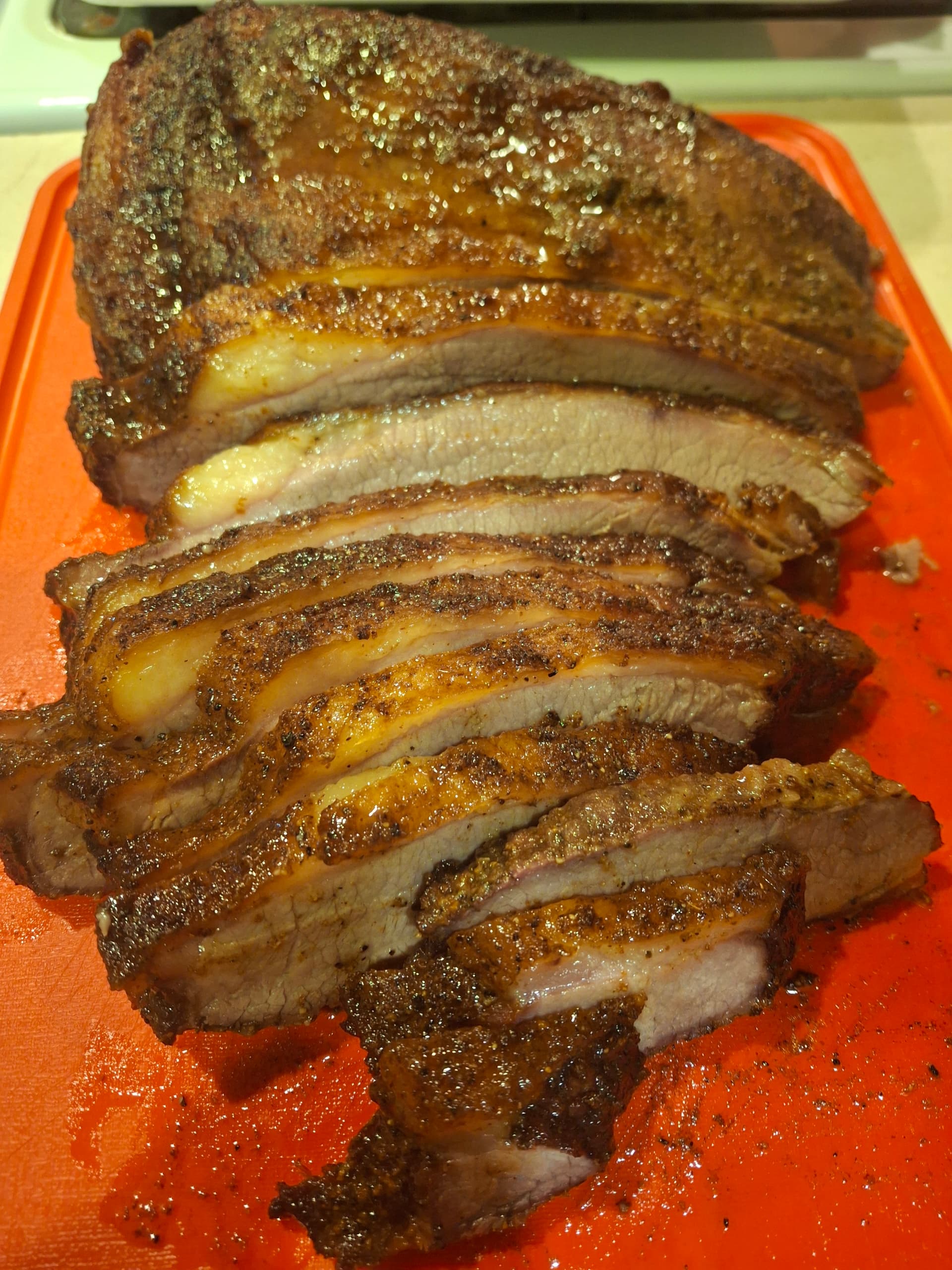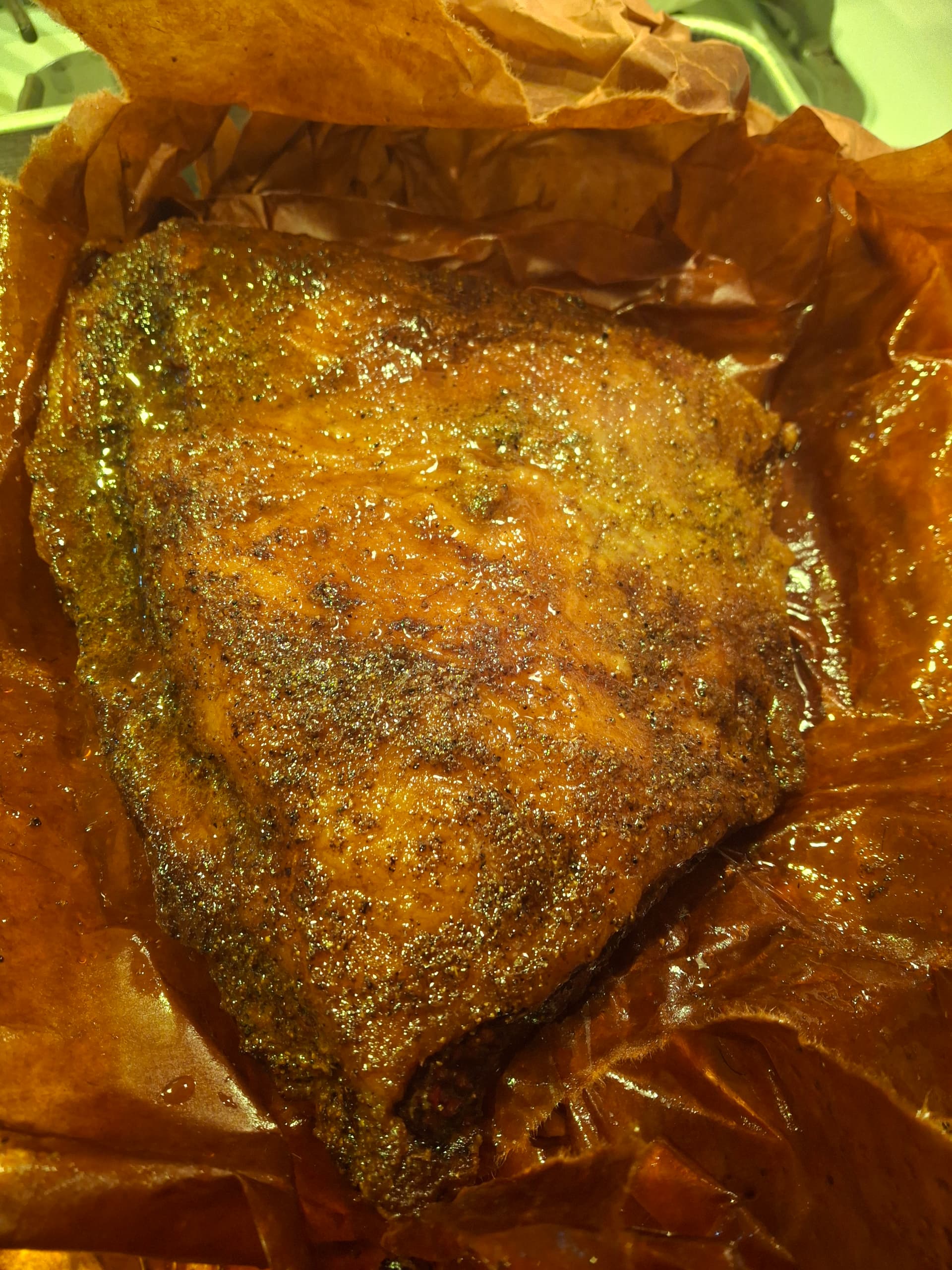 Getting better. This time I used butcher paper. Cooked on 275 for 3 hours uncovered. Then wrapped it in butcher paper and cooked for about 2.5 hours and then turned heat off and let it rest in oven for about 30 minutes.