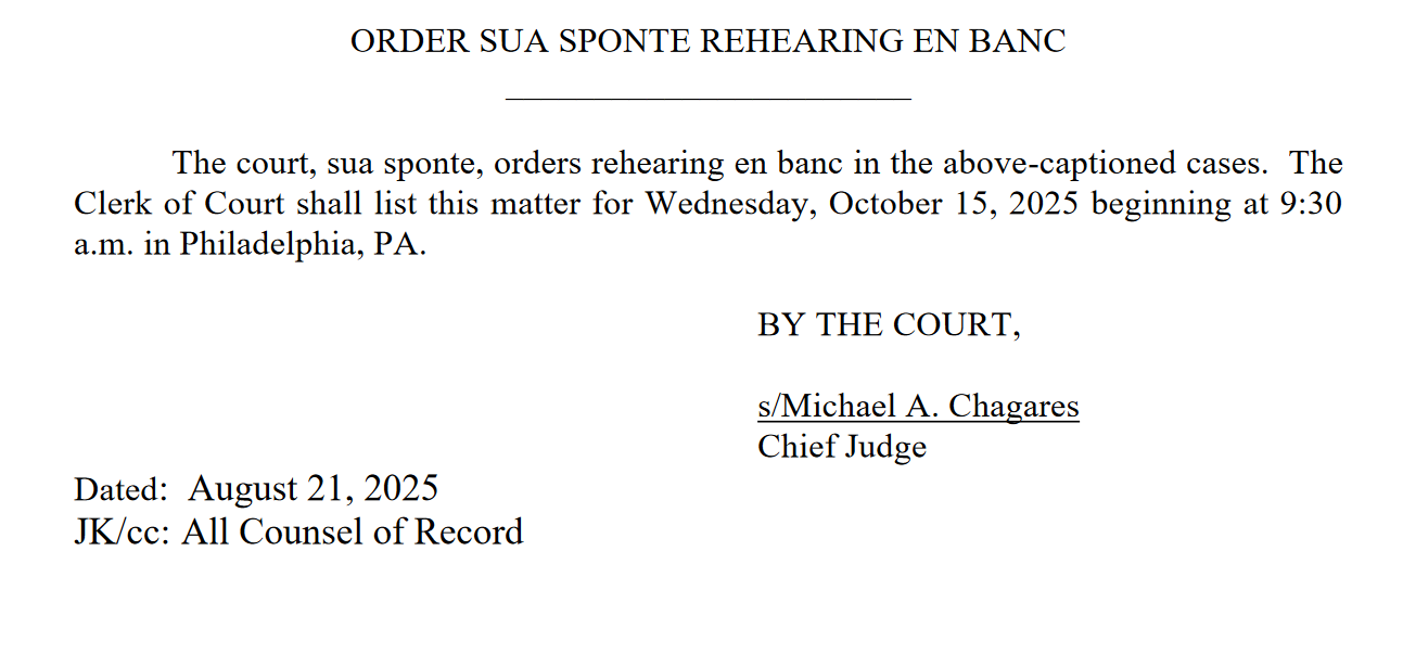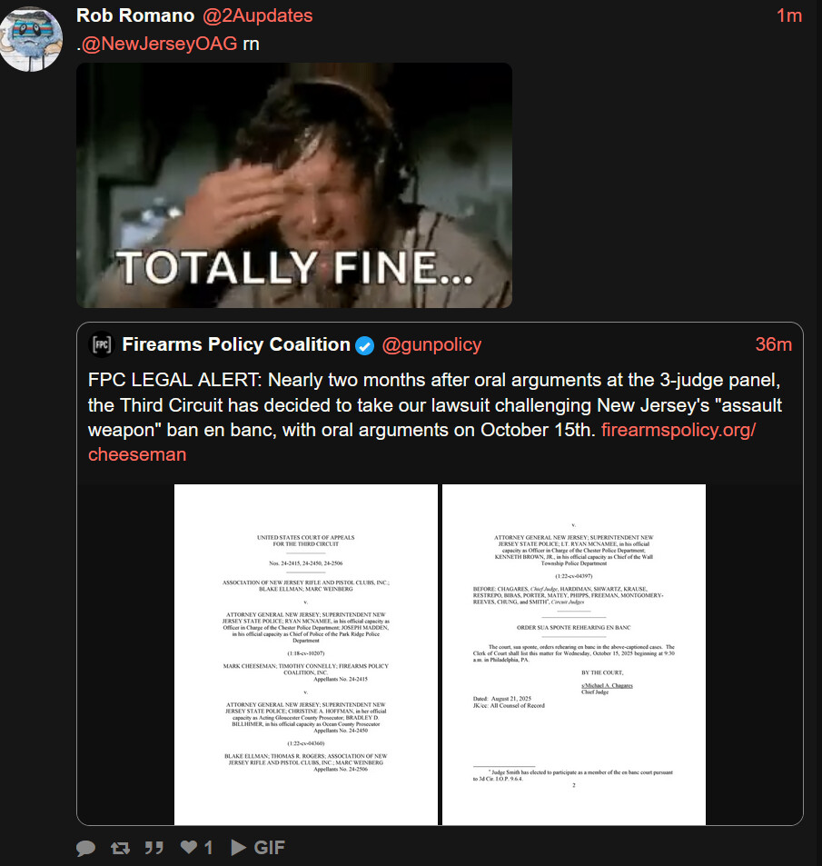 Combined cases Cheeseman v Platkin and ANJRPC v Platkin which challenges NJ’s AWB and Magazine Capacity, having been argued on July 1 has now been ordered Sua Sponte by 3rd Circuit chief Judge Chagres to be heard EN BANC October 15th with the following 13 judges: CHAGARES, Chief Judge, HARDIMAN, SHWARTZ, KRAUSE, RESTREPO, BIBAS, PORTER, MATEY, PHIPPS, FREEMAN, MONTGOMERY- REEVES, CHUNG, and SMITH.
