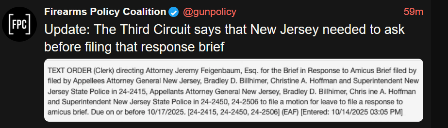 TEXT ORDER (Clerk) directing Attorney Jeremy Feigenbaum, Esq. for the Brief in Response to Amicus Brief filed by filed by Appellees Attorney General New Jersey, Bradley D. Billhimer, Christine A. Hoffman and Superintendent New Jersey State Police in 24-2415, Appellants Attorney General New Jersey, Bradley D. Billhimer, Chris ine A. Hoffman and Superintendent New Jersey State Police in 24-2450, 24-2506 to file a motion for leave to file a response to amicus brief. Due on or before 10/17/2025. [24-2415, 24-2450, 24-2506] (EAF) [Entered: 10/14/2025 03:05 PM]