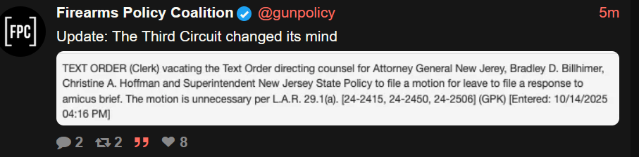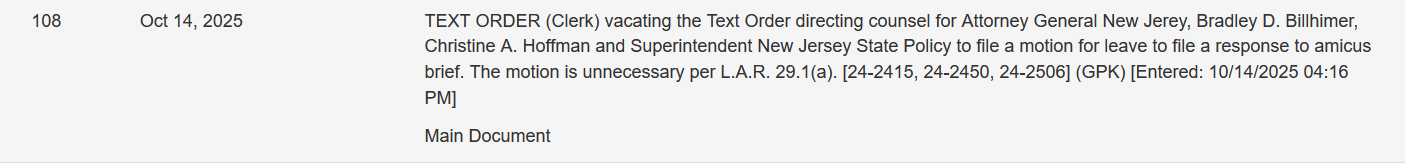 TEXT ORDER (Clerk) vacating the Text Order directing counsel for Attorney General New Jerey, Bradley D. Billhimer, Christine A. Hoffman and Superintendent New Jersey State Policy to file a motion for leave to file a response to amicus brief. The motion is unnecessary per L.A.R. 29.1(a). [24-2415, 24-2450, 24-2506] (GPK) [Entered: 10/14/2025 04:16 PM]
