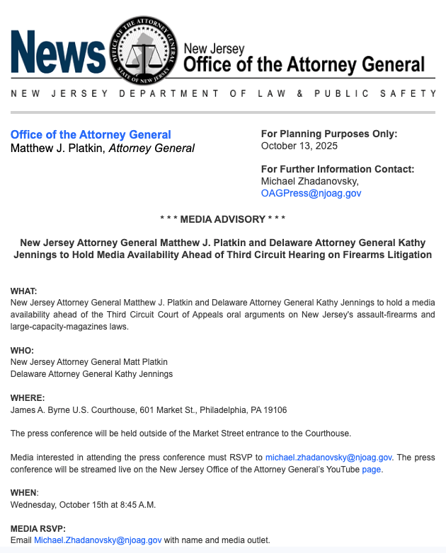 The New Jersey Attorney General’s press conference, which will take place 45 minutes before the Third Circuit goes into session, will be livestreamed here at 8:45 AM EDT on Wednesday, October 15, 2025.