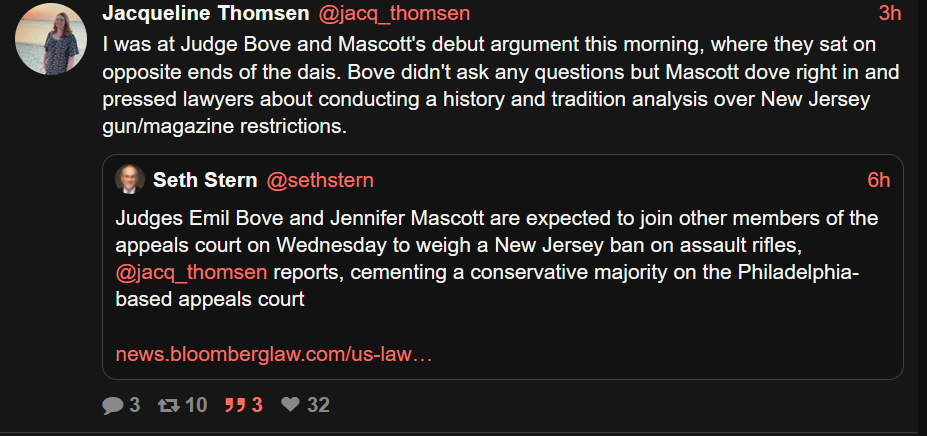 My assessment of today’s AWB argument. First I was thrilled to see Justice Mascott take her place on the panel. Her questions showed an understanding and sincere interest in second amendment rights. She is definitely a textual reader of the Constitution.