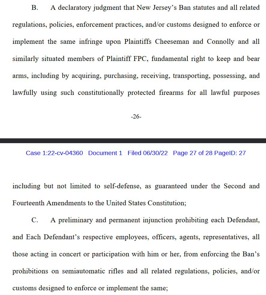 @Revenger - appreciate the interest. The resources you need to answer your questions are in this thread. From the Cheeseman v. Platkin complaint which is available from the docket link in the first post - part of the requested relief: [image] If NJ is barred by court order from enforcing the AWB statute as currently written, what happens? I believe we revert to federal rules on long guns.