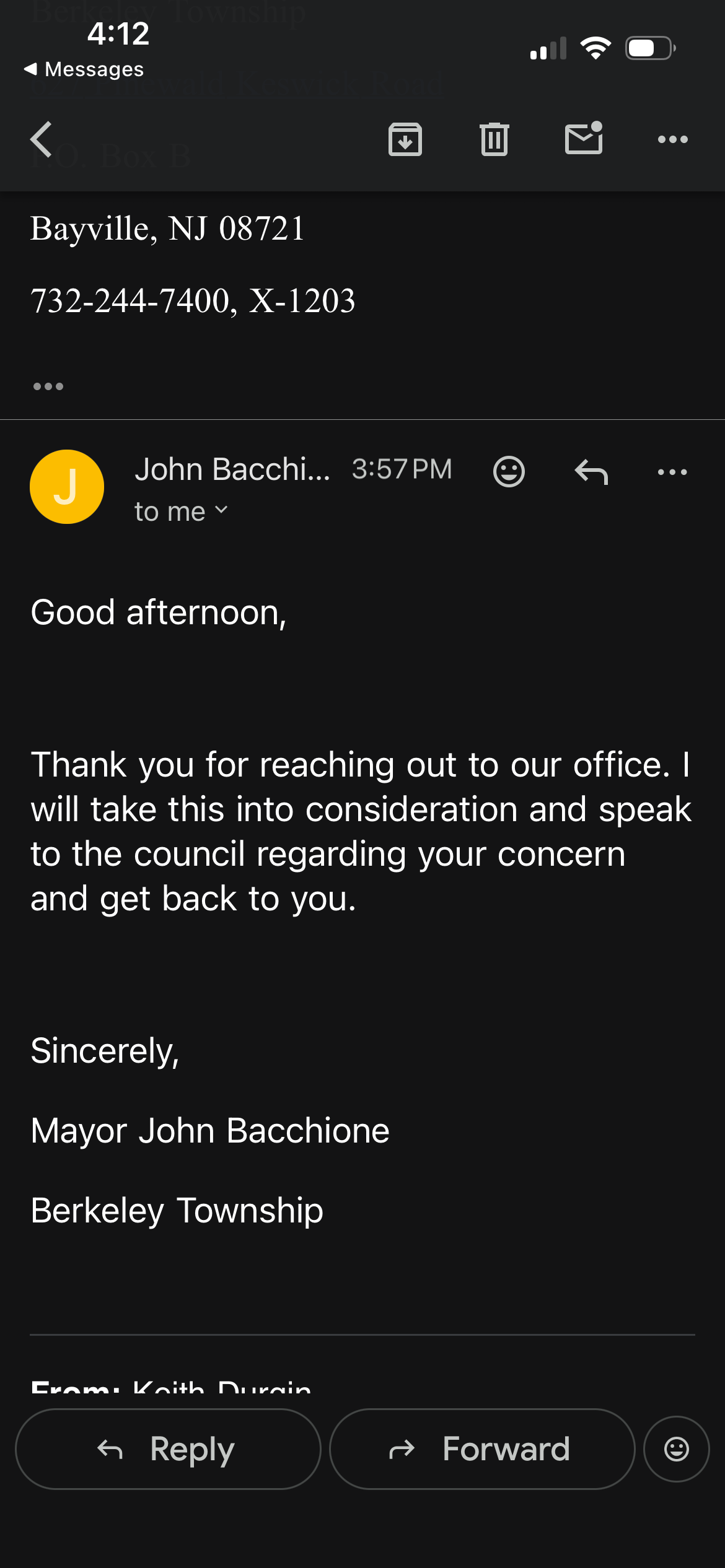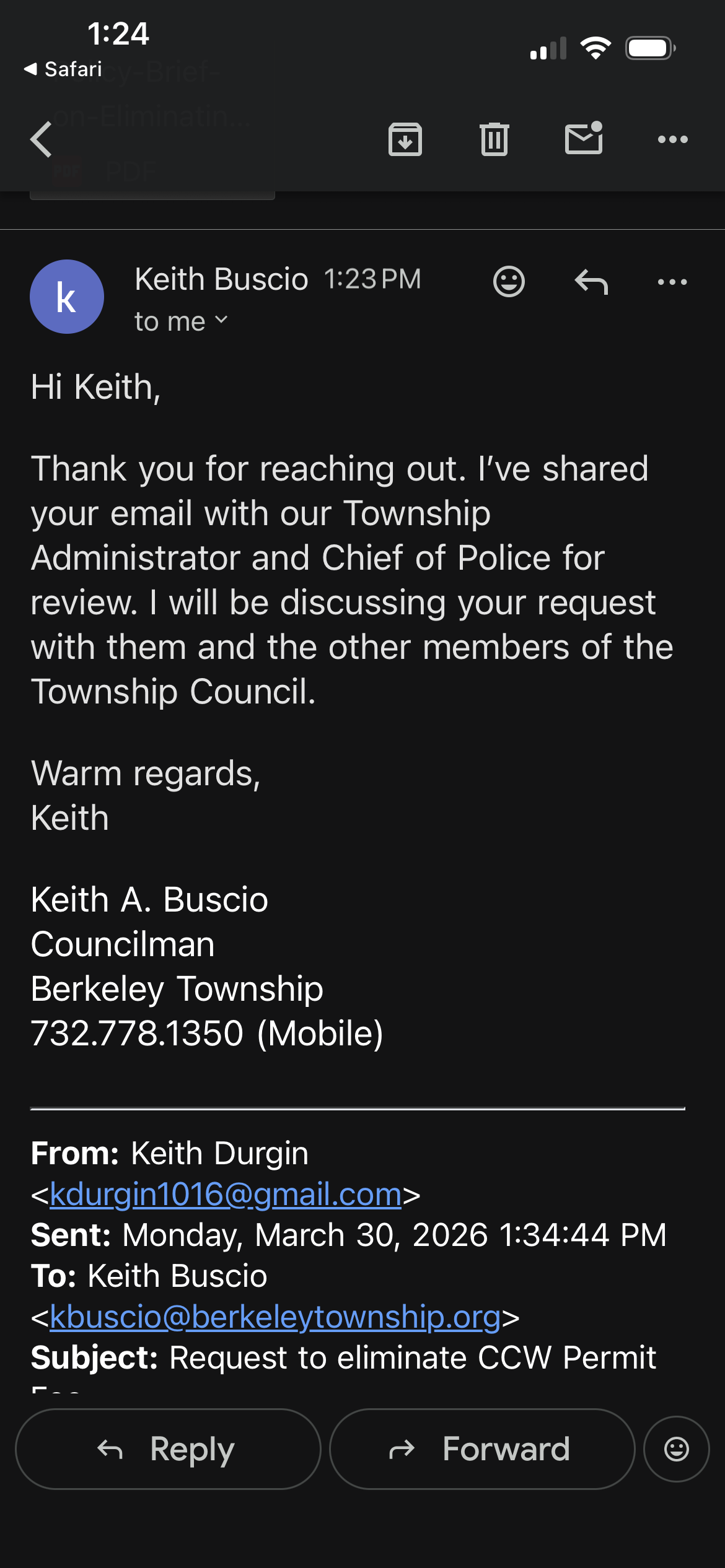I have emailed the Mayor and each council member of Berkeley Township individually and have gotten a response from the Mayor and one Councilman (see response below). I have posted this on Firearms Syndicate on Facebook asking for attendance at the next Town Council meeting and maybe get a speaker to represent us at this meeting and at the very least bombard the Mayor and Town Council with emails and really didn’t get any response I highly doubt I’m the only CCW in this Town and I can’t believe CCW holders in this Town do not want to even try to abolish this $150 fee. Rant over