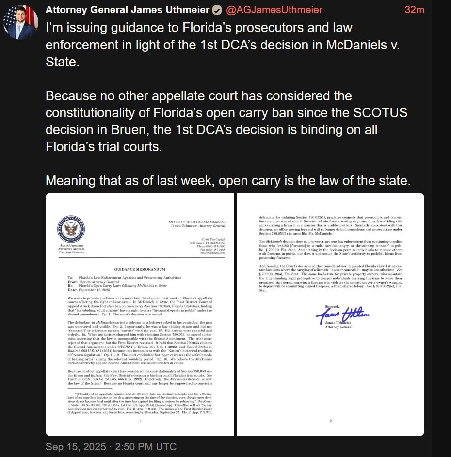 Florida - Open Carry No Longer Prosecuted As of 09/15/2025