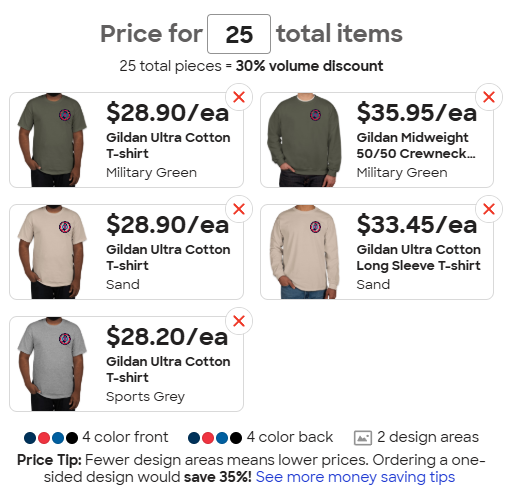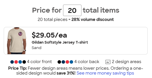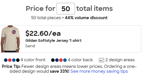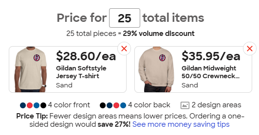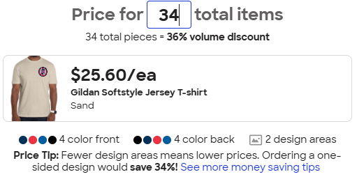 Good question, I’m not sure. I will check on that and 3rd garment type. When I tried to add the long sleeve tshirt all the prices went up but it was late. We may have to limit it to the 2 garment types and take a poll on a color.