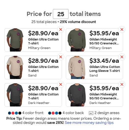 Looking at this a bit more the ‘Group Buy’ is probably the better way to go as it allows for more options and is slightly cheaper per item. If you’d rather a long sleeve shirt or a sweatshirt we can have those as options on the ‘Group Buy’ so let me know what you prefer. I think I may want a sweatshirt for the winter. If you want another option let me know. Here’s the pricing if we can get to 25 items: