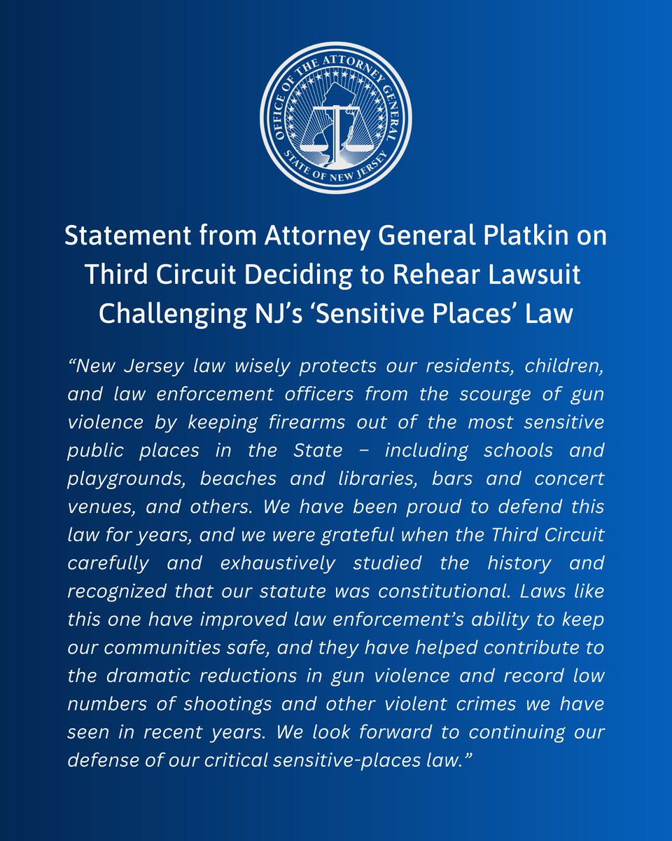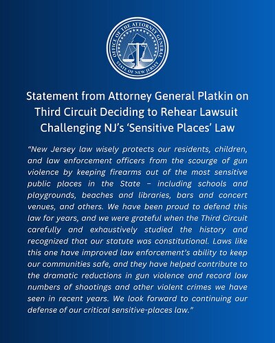 IN CARRY-KILLER CASESeptember 10, 2025. The mid-level federal appeals court in ANJRPC’s lawsuit to overturn New Jersey’s carry-killer law issued a mixed ruling today, gutting large portions of the favorable judgment ANJRPC obtained from the lower court back in 2023. The appeals court upheld all of the specific so-called “sensitive place” carry bans (e.g. parks, beaches, museums, etc.) that the lower court had temporarily stopped. Importantly, however, the appeals court agreed that the carry ban on private property open to the public and the ban on carry in private vehicles could not stand.