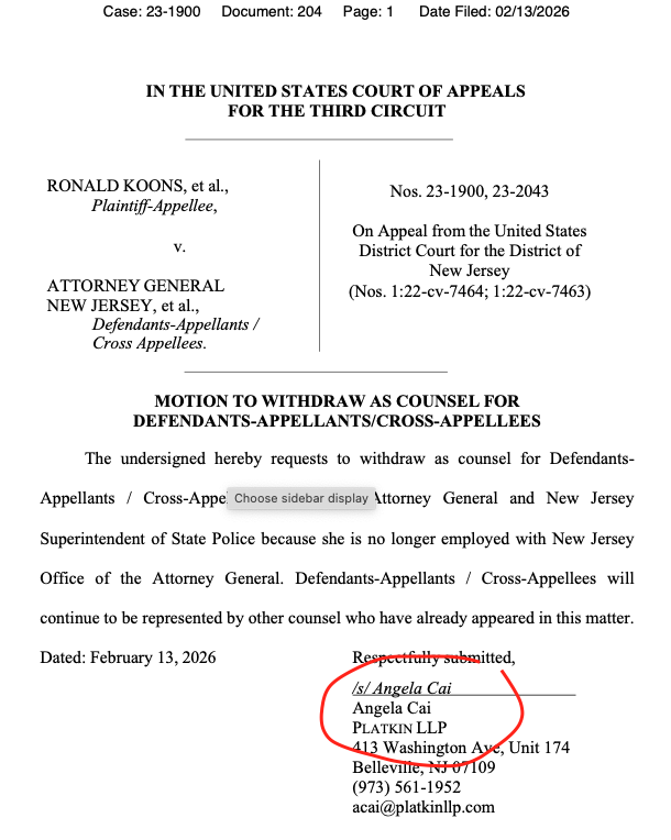 Angela Cai is withdrawing as a litigator for NJ so she can join Platkin’s new private practice: