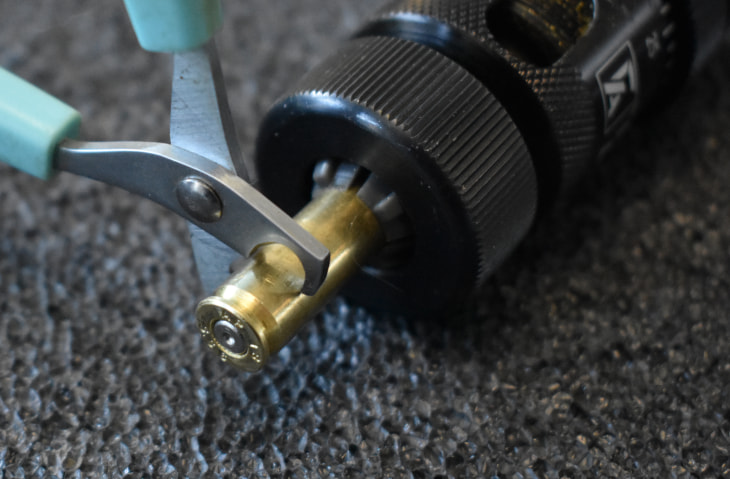 Now, to cut the case head off. Well, all I’m going to say is this. It is not my fault the Frankford Arsenal universal case trimmer looks a LOT like a lathe chuck. Some of you may recognized the advanced cutting tool I used.