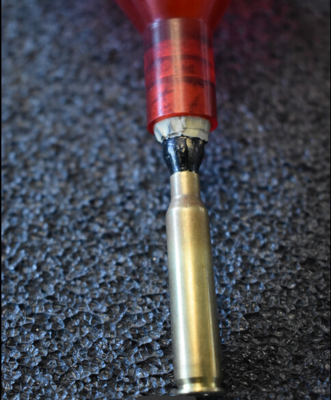Wrapped some masking tape around the case body until it fit snugly in the Lee funnel, then trimmed off a bit for a flush fit. Deburred with 800 grit sandpaper.