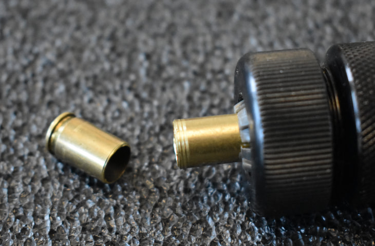 I chucked a case, rear end first, and inserted a drill bit for a mandrel. I tried regular pliers and a wrench first, didn’t do much except chew up the neck. So I dug through my rarely used tools toolbox and VIOLA, there she is. A non grippy hand tool tool with an arbor and die made just for this day.