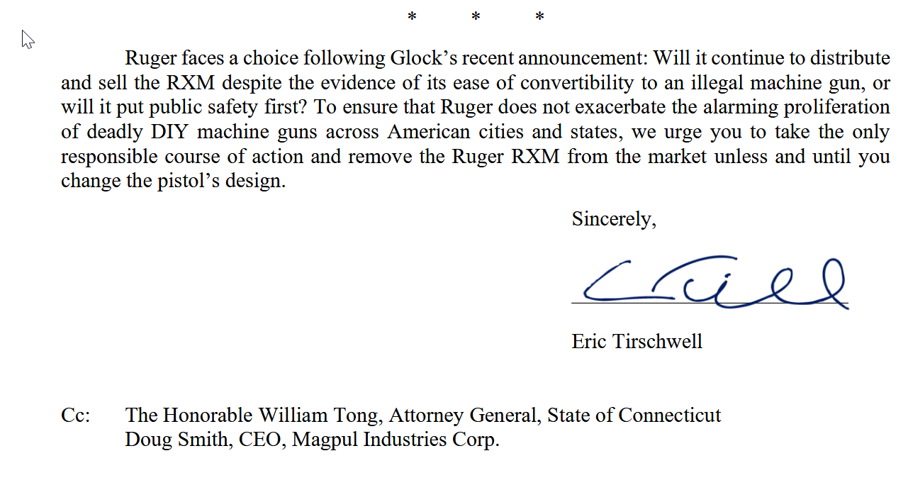 The full letter from Everytown to Sturm, Ruger & Co, regarding the Ruger RXM handgun:
