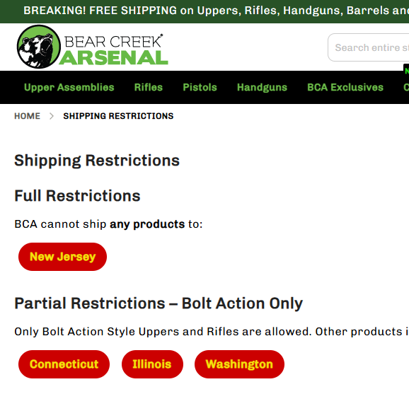 I bought 4 Bear Creek Uppers over the years and all of a sudden I tried to order an upper from them and they wont ship anything to Jersey anymore. If you look at their shipping restrictions it says they don’t ship anything to New Jersey