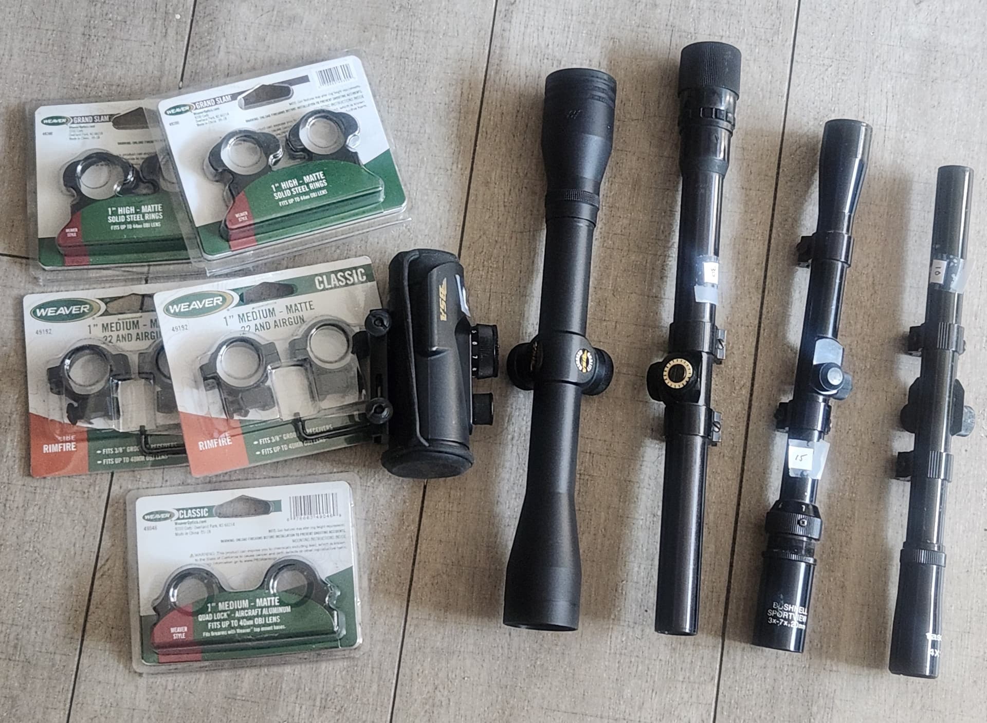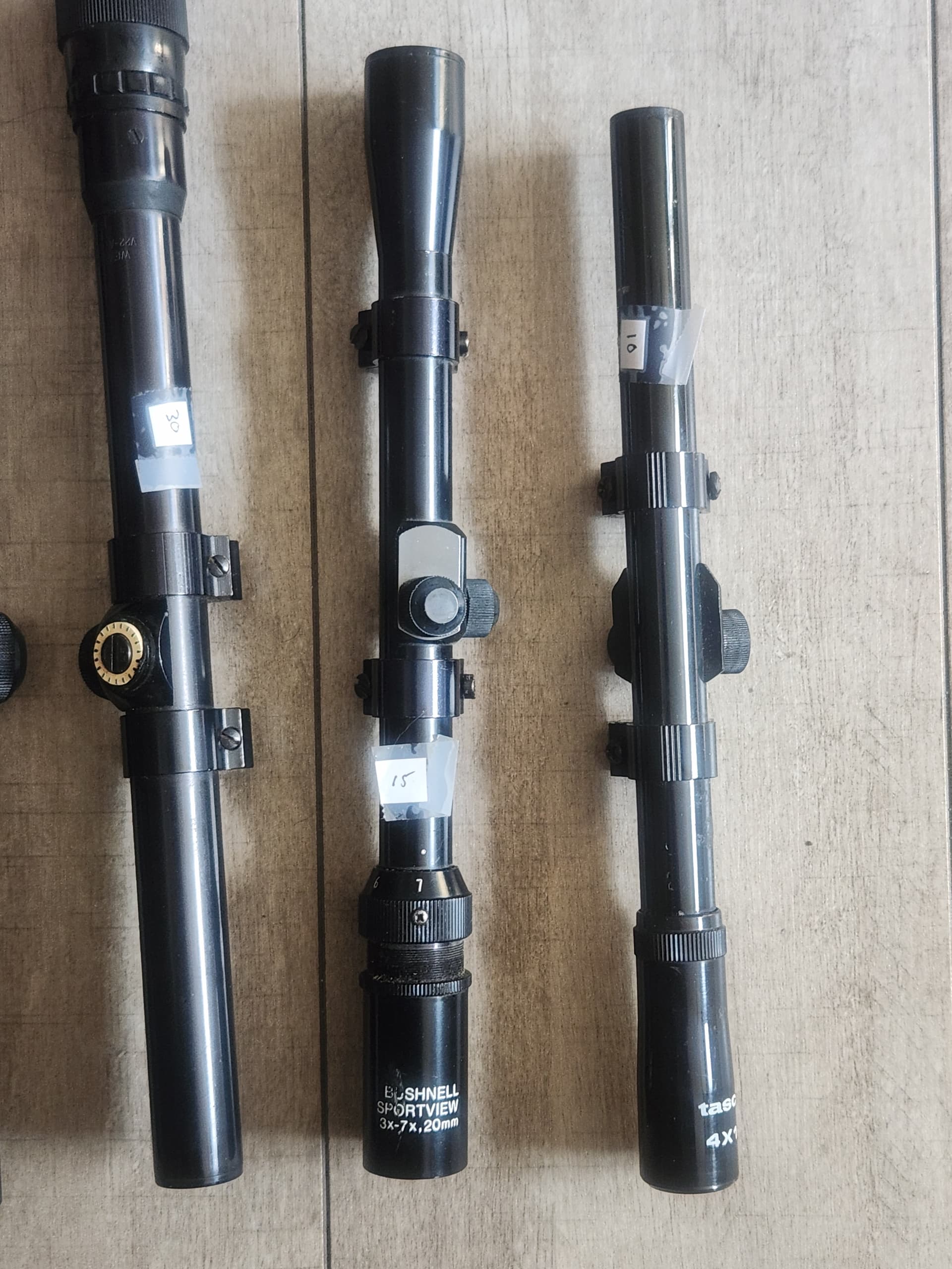 The one you can’t see the label on (in the middle missing the cap, you can see the round adjustment circle) is a Weaver V22-A (made in USA)