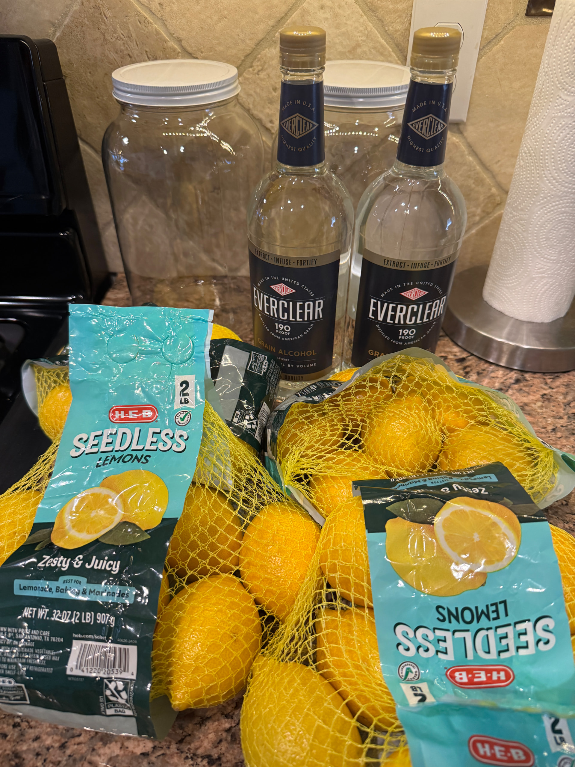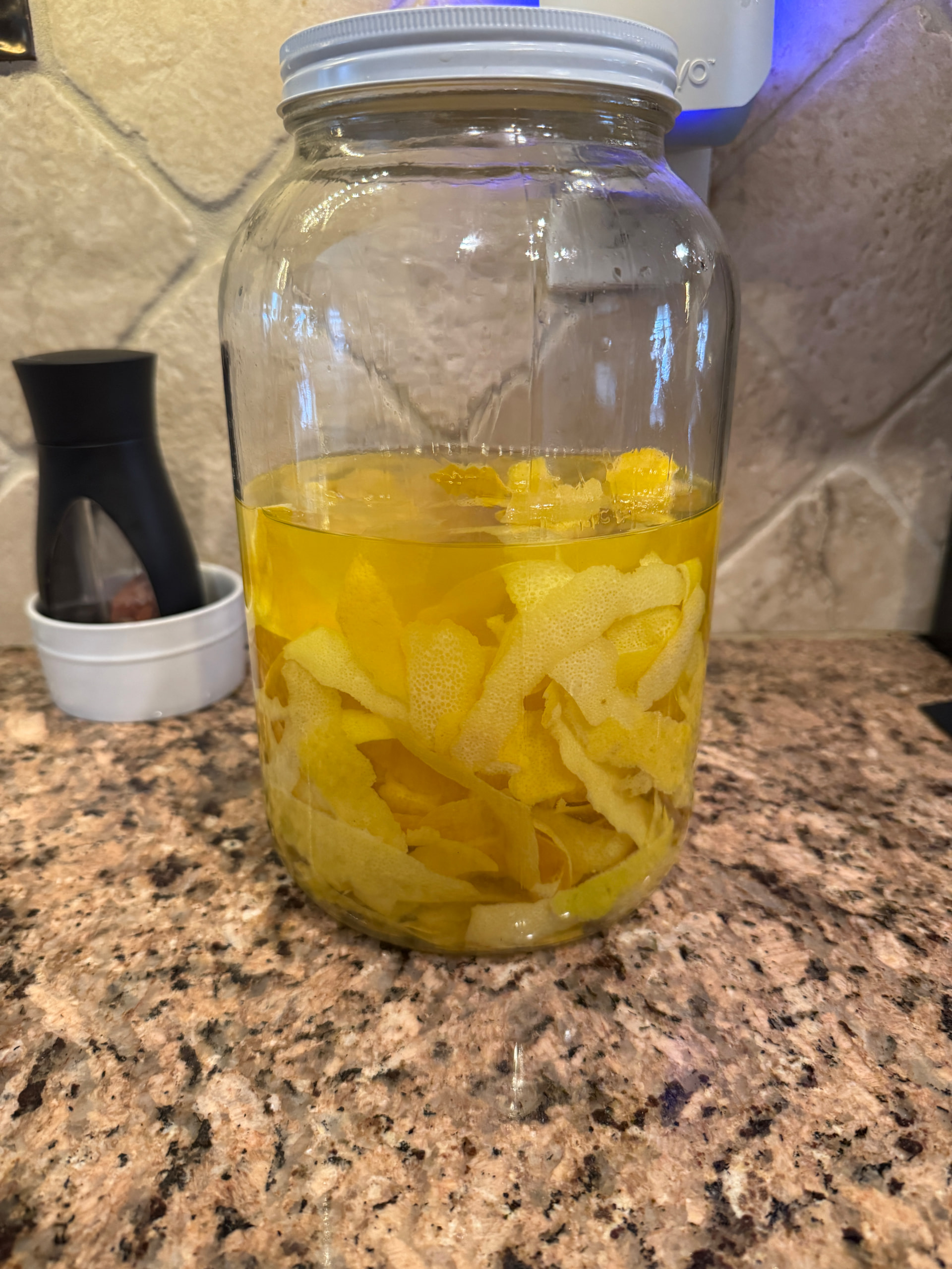 Place your lemon peels in a gallon glass jar, and pour in the Everclear. Lid the jar, put it in your pantry for 2 weeks, shaking it daily.