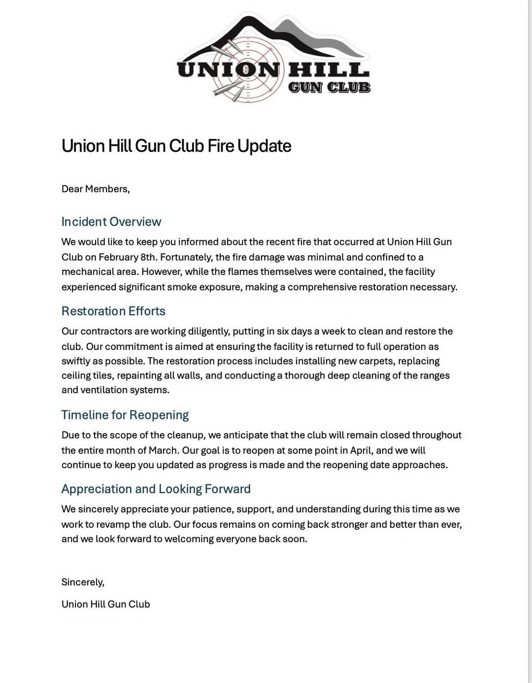 As most of us in the Second Amendment community are aware, three Sunday’s ago Union Hill Gun Club suffered a small fire on February 8, 2026 in the range equipment area, that spread smoke damage throughout the structure. The range, the gun store and CNJFO life member and sponsor Rocco LaRocca’s R.O.C. Training are all temporarily closed as a result. Union Hill Gun Club is also “home” to CNJFO’s Youth Educational Program that instructs today’s youth in the safe handling of and marksmanship with firearms.