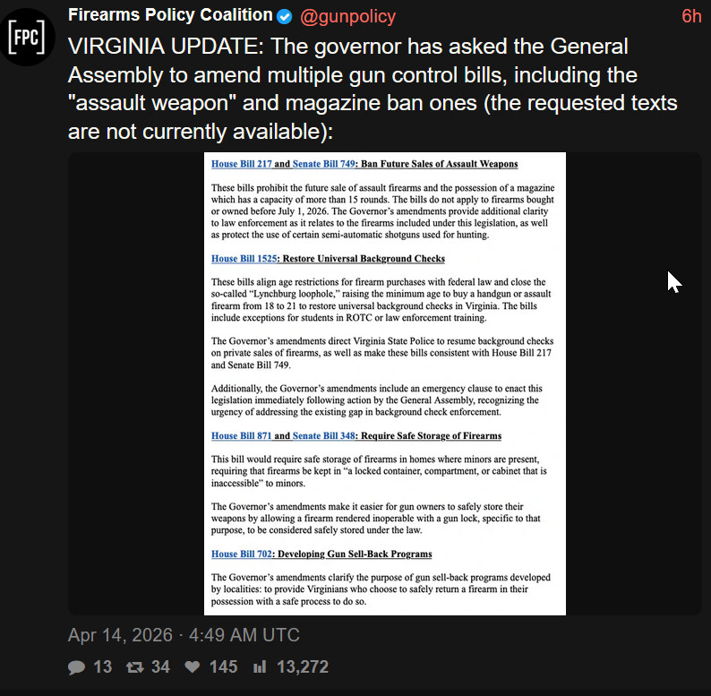 Good to see that Virginians elected a moderate governor. I’m sure these are just “common sense” gun laws.